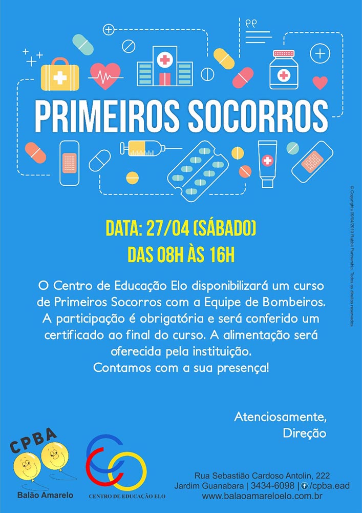 Sempre atentos à segurança e bem-estar de nossos alunos, nós, da equipe do Centro de Educação Elo / Balão Amarelo, participaremos, no próximo sábado, 27 de abril, de um curso de Primeiros Socorros na sede de nossa Escola.